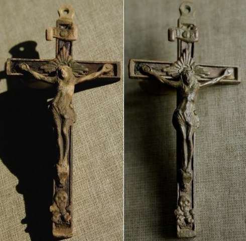 Il n'est pas commun de trouver un crucifix complet (90 mm x 45 mm). Il devait être placé à la tête d'un lit...? ou ailleurs...? et trouvé loin de tout dans un bois ?!...
