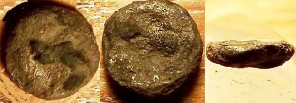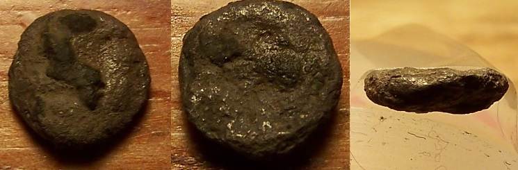 Elle mesure 9mm., pèse 0,75gr. et la photo de la tranche montre, grâce à un peu de gangue cassée, l'âme du 'cookie' en argent Je pensais à un bronze lors de la découverte...