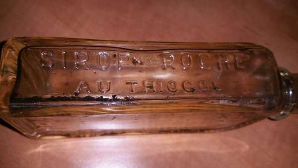 Enfin, à une trentaine de cm, cette ancienne bouteille de 1920 (dixit internet) de 'sirop Roche au Thiocol', peut-être abandonné par un soldat à la gorge irritée