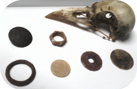 ;aujourd'hui sortie dans les sous-bois d'une vallée,pas de merveilles dans la musette--un bouton n°48-une petite fusaiolle-un anneaux en bronze-5 ct de franc-une pièce à trou toute rongée-un bon pour 1fr-et ce joli reste de Corvidé.. vive l'animisme et ces génies protecteurs.....à rajouter à ma petite collection