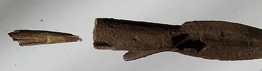 KEZAKO13 , superbe pointe de fleche à douille et barbelures du bronze final / Hallstatt et mieux avec ce petit bout de bois Mon frangin avait sorti une hache à douille avec du bois fossilisé dedans ! je trouve ça terrible !!