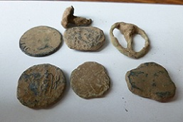 [1853] ,a tous, sortie dimanche dernier, deux grosses tètes de clous que je pense romain,50x50 ,avec trois monnaies romaines, pour le partage,bonne journée a tous.