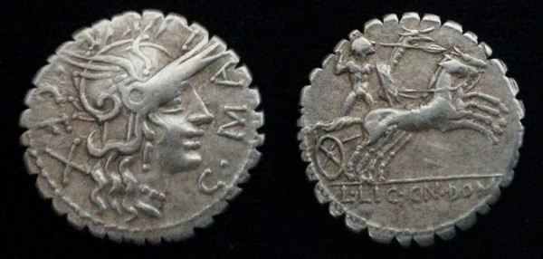Ce denier commémore l'effondrement de l'Empire arverne en 121 avant J.-C. et la défaite de son roi, Bituit (Bituitus). La province de Narbonnaise fut créée pour défendre la 'Provincia' et les intérêts de Rome en Gaule Transalpine. La ville de Narbonne (Narbo Martius) fut fondée en 118 avant J.-C. Cinq monétaires sous la conduite de Lucius Licinius Crassus et de Cneius Domitius Ahenobarbus frappèrent des deniers 'serrati' (dentelés, pour éviter les contrefaçons et les sauçages) : Lucius Cosconius, Caius Malleolus, Lucius Pomponius et Lucius Porcius Licinius. Mr. H. Zenacker pense comme Sydenham que cette série aurait été fabriquée entre 112 et 109 avant J.-C. Michæl Crawford penche pour 118 avant J.-C., l'année même de la dédicace de la nouvelle cité. Mr. H. Zehnacker in Moneta, p.849, faisait remarquer que : 'Les revers présentent une plus grande unité, manifestement due à la gravure d'un prototype spécial, Bituitus sur son char'. De plus le roi est représenté menaçant, chargeant, donnant ainsi une impression de danger qui renforce le rôle de son vainqueur Domitius. Ce revers n'est pas sans analogie avec celui de Lucius Hostilius Saserna qui sera utilisé soixante-dix ans plus tard (48 avant J.-C.), présentant cette fois-ci Vercingétorix, dans la même attitude combative