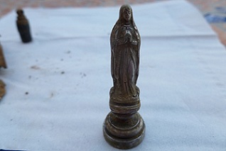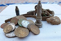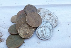 [1853] , a tous , sortie de cet après midi sous un beau soleil,monnaies américaine donc deux en argent, quelque pièces de nos anciens francs, une plaque de vélo,une petite voiture, et une petite sainte vierge, un vieux bouton, pour le partage, photo après nettoyage, bonne soirée a tous.
