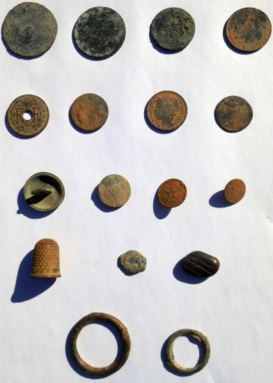 - Un dé à coudre de facture récente. Un chaton de bague en bronze à nettoyer pour voir le motif.