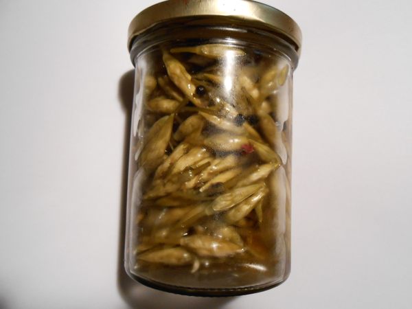ma contribution: pour cette année, boutons de fleurs d'ail des ours, vinaigre balsamique blanc, cinq baies, romarin, laurier, et une pointe de sucre, attendre un mois environ