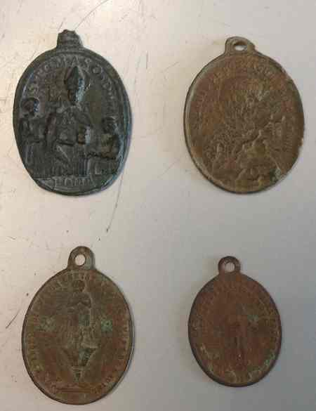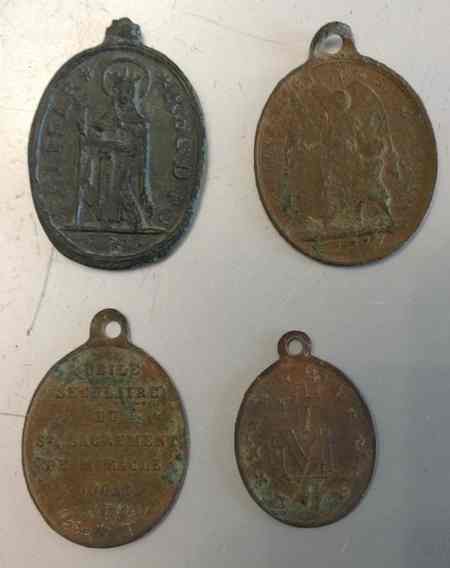 Pour la médaille 1 vu la forme de la bélière 17eme /18eme siècle avec une préférence pour le 17eme. Les autres 19eme Celle du bas à droite