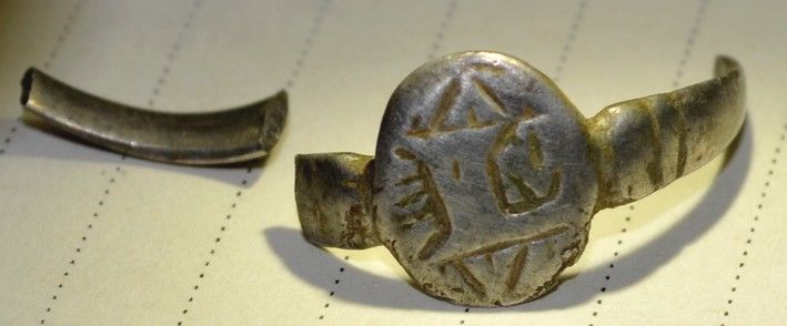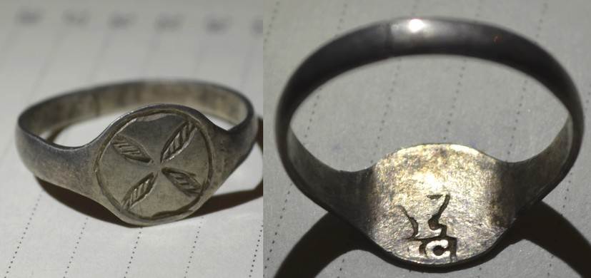 Voici la première en argent qui est malheureusement cassée, je pense à une bague rébus 'LM' pour 'elle aime'...