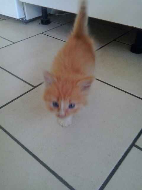 Qu'est ce qu'il foutait au milieu d'un bois, il avait toutes les chances de se faire bouffer ? pôv' tite bête ! il a du bol de t'avoir croisé. N'hésite pas à multiplier les photos sur les réseaux sociaux, tu as toutes les chances de lui trouver un maître. la couleur n'est pas courante !