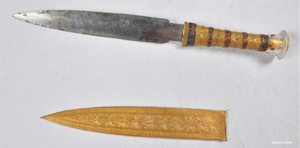 En utilisant une technologie non-destructrice (la spectrométrie de fluorescence des rayons X), une équipe de chercheurs italiens et égyptiens a confirmé que le fer de la dague qui se trouvait contre la cuisse du jeune pharaon était d’origine météoritique.