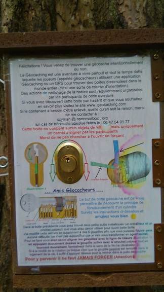 Fortuitement, trouvé en forêt, cette cache pour géocacheurs, accrochée à un arbre; pédagogique, car elle propose de faire découvrir le fonctionnement d'une serrure de verrou