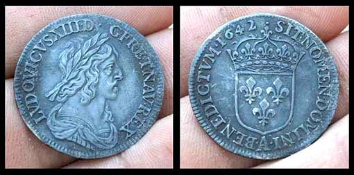 Je suis sur le cul d'avoir trouvé ce magnifique quart d'écu Louis XIII aujourd'hui au cours d'une belle sortie avec un ami dans un bois en bordure de rivière.