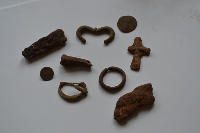 Bien variée ta sortie matinale, il y du boulot de nettoyage mais on a vu que tu sais faire. La croix a l'air bien ancienne, la boucle est sympa, et l'objet du côté gauche de la monnaie a une forme curieuse.