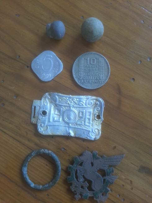 un anneau, une balle de mousquet, une piÚce de 10 francs 1948, une plaque fiscale de vélo, une piÚce d'Inde c'est dingue!!! et un insigne avec croix de Lorraine et cheval ailé.
