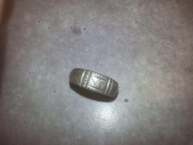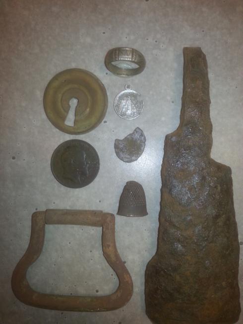 un cache serrure, one penny 1906, un dé, une grosse boucle, une médaille, un fragment de médaille, une espèce de râpe, et une bague probablement façonnée par un soldat.