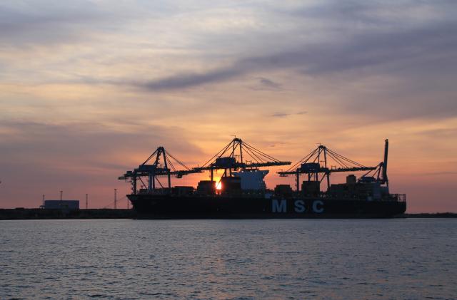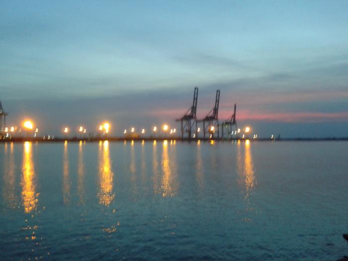 couché de soleil sur le quai porte conteneur Photo avec le téléphone