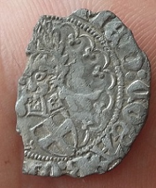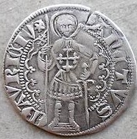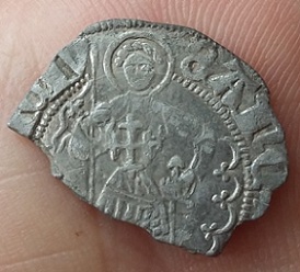 j'ai le plaisir de vous présenter cette magnifique monnaie de Savoie, fortuitée il y a quelques années dans un petit bois de la Haute-Savoie. Il s'agit d'un demi-gros d'Amédée VIII représentant Saint Maurice (type Mauriziano frappée entre 1391 et 1416). Elle est bien entendu cassée et il ne me semble pas que l'on puisse distinguer le symbole de l'atelier, hélas!