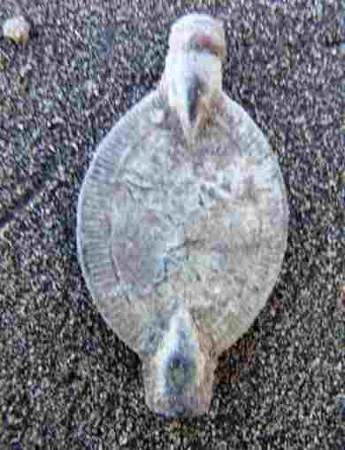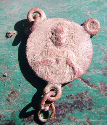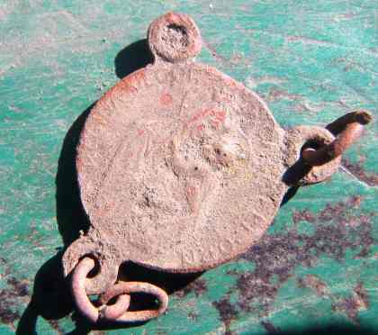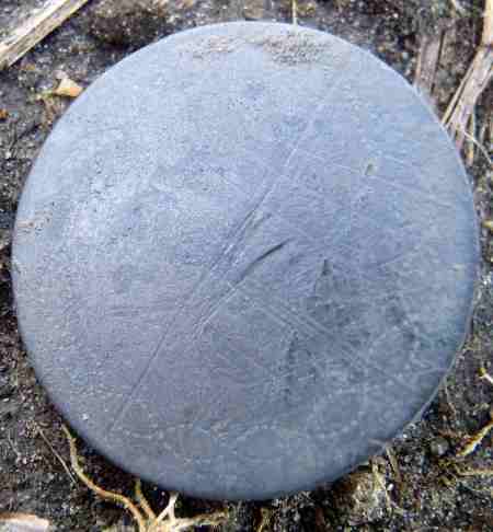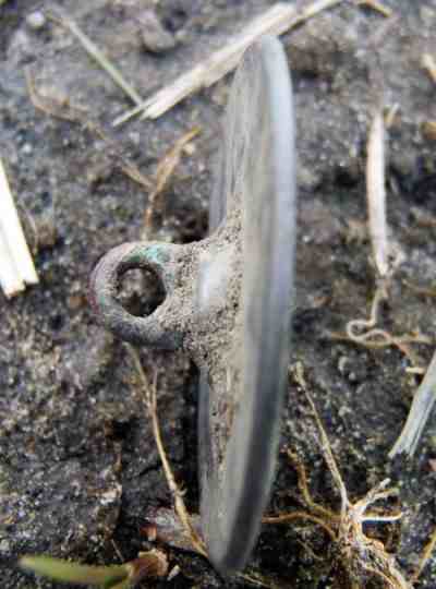 Michel a trouvé ce gros bouton ( diamètre 3.5 centimètres ) et j'ai cru a un bouton de tente. bon Bip a remarqué la matière tombac et a daté l'époque ( antérieur 1850 ). On remarque quelques motifs autour du bouton. A voir au nettoyage.