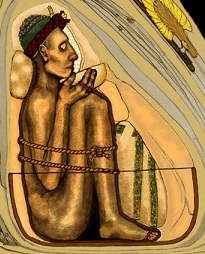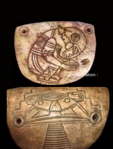 Pour la première tablette en R0 à supposer qu'elle soit authentique je pencherais pour la représentation d'une momie en position fœtale avec un bandeau sur le front et une céramique entre les mains ( les soucoupes volantes ne tiennent pas dans la main ) comme sur ce schéma d'une tombe de la civilisation des Paracas :