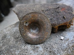 Je ne pense pas qu'elle ait servi de cible mais cette déformation parfois visible est en réalité le début du travail de retournement à froid d'une pièce afin de réaliser...une bague.