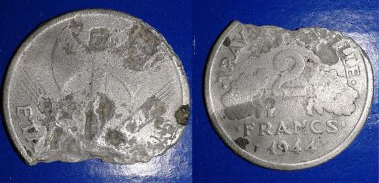 une 2Fr alu 1944 grignotée ,mais quel bonheur de trouver des vieilles monnaies sur la plages au lieu de nos centimes d'euros tous rouillés.