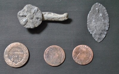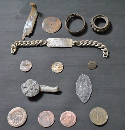 Belle variété dans tes trouvailles, la médaille religieuse est très curieuse, ton bout de cuivre ajouré fait penser à une agrafe. La gourmette porte une inscription, un prénom ?