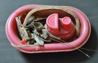 J'ai aussi trouver un petit bateau en plastique échoué sur le rivage ,j'y est mis les plombs et cuillères de pêche ainsi qu'ujn bout d'armature de porte- monnaie...