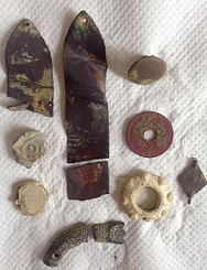 Une petite 25c de 1932, 2 plombs de sac (est-ce possible de dater ceci ...?), un bouton, une rouelle (c'est gaulois non ?), et enfin plusieurs objets a identifier ...
