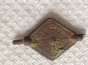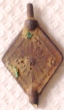 Je pensais a une medaille religieuse mais les fixation me font penser a un pendentif ... un côté est une petite tige et l'autre est creux du diametre de la tige donc surement un assemblage de plusieurs petit losange ..