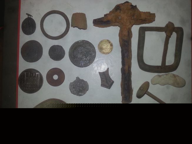 Petite ballade de 3 heures dans ma campagne, avec pas mal de choses variées, une médaille, un anneau, un dé, 2 savos, un pied de tour Eiffel, une cuillère, une boucle, des plombs, 10 frs 1931, 10 cts 1923, one penny 1920, 5 cts 1972.