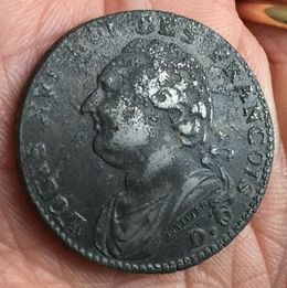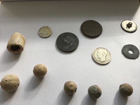 une 10 centimes Etat Français de 1942 en piteux état, une 50 centimes 1941, un sol à l'écu de 1786 un peu fatigué, une drachme en argent de George Ier de Grèce 1873 dont on se demande bien ce qu'elle faisait là , une douze deniers au faisceau de 1793 avec de très beaux reliefs, un bouton en tombac et quelques projectiles divers....