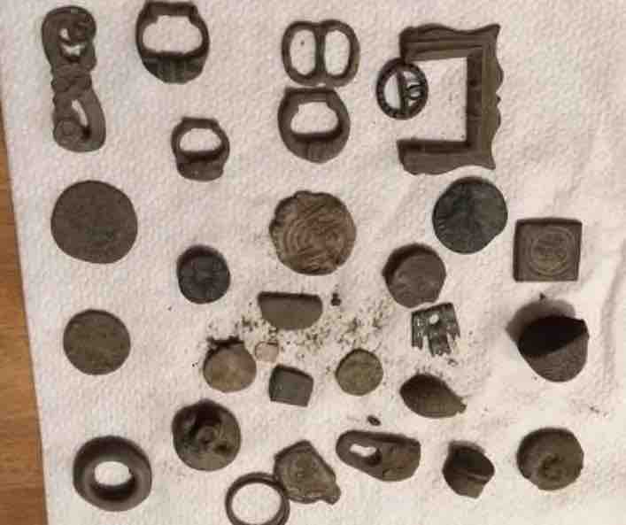une petite romaine, un vieux dé à coudre, un poids monétaire , des boucles, un billon sympa,...