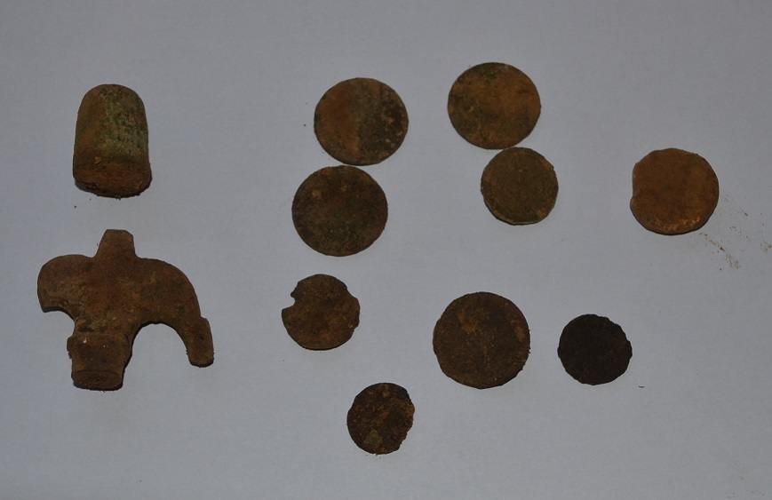 Deux boutons militaires, une clé de robinet