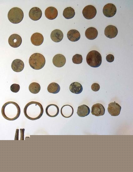 Il y a du travail pour le nettoyage des monnaies (c'est pas mon fort) qui sont bien usées. J'espère que les deux petits bronzes seront identifiables.