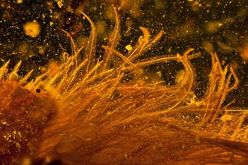 第一個已知的恐龍尾巴保留在一塊琥珀最近由古生物學家利達星發現,而收集樣品在緬甸去年。追溯到中間白堊紀時期大約99萬年前,大約杏子大小的琥珀包含一個1.4英寸附件8個椎骨明確無誤地覆蓋在原始的羽毛。科學家排除了尾巴屬於一隻鳥的可能性,並基於其結構,相信它來自一個少年coelurosaur,一組恐龍包括暴龍。通過國家地理: