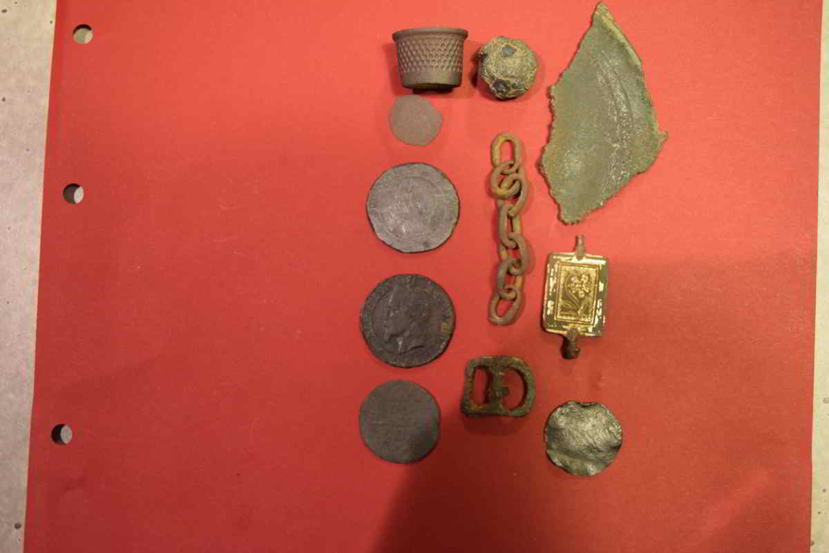 Pour le partage, le résultat de cette petite sortie avec ma première clé de montre, trop content, sinon de la monnaie Napoléonienne, un liard de France (D), une balle de mousquet, des savonnettes, une minuscule boucle, un dé, une chainette.
