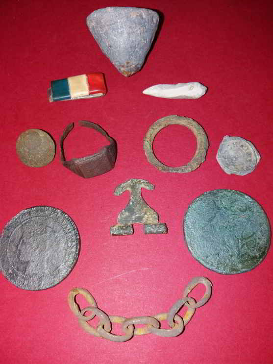 un plombs conique, une attache tricolore, un plombs en forme de canine, un bouton de grenadier, un anneau, un plombs de sac, 2 monnaies, une chainette, un fermoir? et une belle bague.