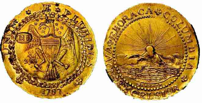 Cette pièce d'or réalisée par l'orfèvre Ephraim Brasher arbore un aigle accompagné des initiales de l'orfèvre imprimées sur ses ailes. Il existe une pièce similaire possédant les mêmes caractéristiques, dont les initiales sont imprimées sur la poitrine de l'oiseau, et non sur ses ailes