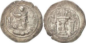 AV: buste du roi à dr. portant couronne à ailes et surmontée d'un globe. Collier, chignon et boucles d'oreilles. Barbe. Texte en péhlevi sur le pourtour dans un cercle de grènetis.