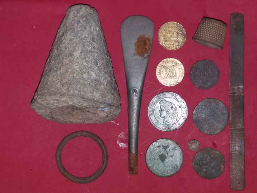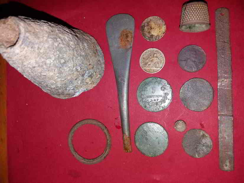 Un gros plombs conique, un manche de cuillère avec un poinçon en forme de croix, un anneau, un dé, un réglet, et des monnaies, bon pour 50 centimes 1923, 50 centimes 1931, 5 centimes 1887, one cent usa, et quelques savos.