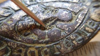 Pour la restauration de matrices de sceau, j'utilise une binoculaire X80 BRESSER. Il n'est pas nécessaire d'avoir un grossissement supérieur à X20. L'outil qui me semble le plus adéquat est l'aiguille à piquer. L'extrémité est en V et convient bien pour les sillons profonds.