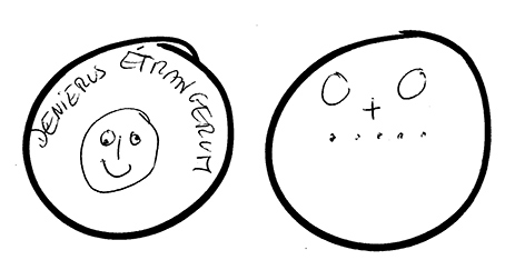 Vous devez me trouver un denier étrangé ou d'un côté il y a un visage de face, et de l'autre, deux cercles avec 5 points et une croix !