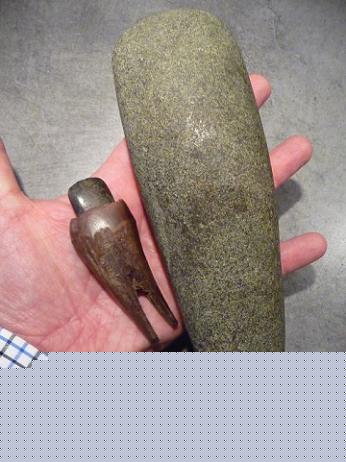 [889] Allez, comme quoi y en a pour tous les gouts : Une hache en dolerite de 24 cm. (originaire de Caen) et la petite lame de herminette trouvee au XIX dans le lac Chalain (Jura).
