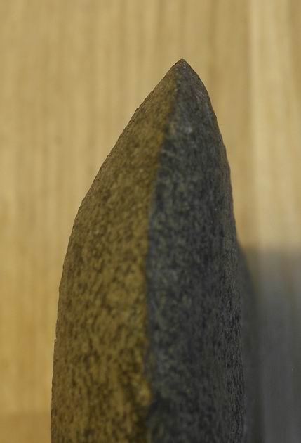 Pour la roche, légèrement verdatre quant elle est mouillée, elle me ferait penser à un basalte. La cassure est plutôt noire. En surface, la matrice, qui inclut des grains noirs, à pris une teinte terreuse. C'est aussi assez lourd. Sur les cotés du tranchant, la surface 'd'affutage' apparaît plus sombre. (si c'est bien ce à quoi je pense).