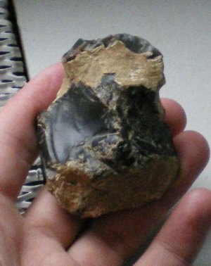 Un peu plus sérieusement, je pense que ce n'est pas un outil, ni même qu'il y ait eu une intervention humaine, même si la forme générale le laisserait penser. Il n'y a pas de traces d'enlèvements classiques nulle part, sauf en R5 où il y a un enlèvement 'en creux' qui aurait pu être intentionnel, mais tout autant dû à une pression externe (piétinement, par exemple : qui peut faire de fausses 'retouches' ... multiples parfois). Mais là , il n'y a qu'un seul enlèvement de ce type. Si cela avait été une retouche, je pense que, tant qu'à faire il en aurait aligné trois ou quatre, comme cela ce voit sur des outils très frustres de ce genre là (mais issus d'un éclat 'orthodoxe', avec bulbe i tutti quanti). Bon, cela n'exclut pas la part de rêve qui fait que, tel quel, ce 'machin' ait pu être utilisé, voire même comme je l'avais très précisement décrit plus haut ...