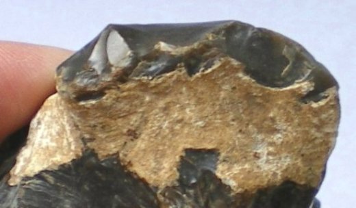 Je reviens complètement sur ma première opinion parce qu'effectivement, ces 3 retouches peuvent difficilement être due à un piétinement, avec le fait qu'elle sont alignées de façon très classiques, qu'il y a même peut être une autre retouche à l'endroit du '?' et pour confirmer le tout qu'il y a de la retouche frustre de l'autre côté. Et, je ne vois pas comment du piétinement pourrait faire des retouches des deux côtés sans retourner le cailloux.