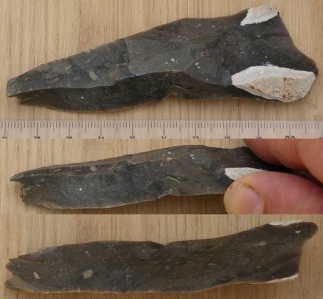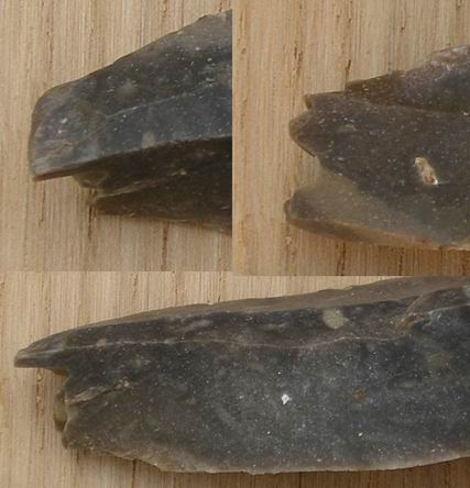 Merci de ces explications. Je crois avoir compris. Pour moi, c'est la pointe qui est concernée, le bulbe a disparu et il y a un espèce d'enlèvement avec rebroussement qui m'intrigue. C'était l'objet de ma question.. Ci-joint des photos plus démonstratives. Mais ce n'est peut être rien d'intéressant. Le dessous est la vue en haut à droite.