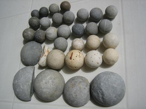 j'ai aussi trouvé plusieurs sphères et une demi sphère en pierre. Pour moi ce sont soit des projectiles pour fronde préhistorique pour les plus petites ou bien pourquoi des billes pour un jeu ?