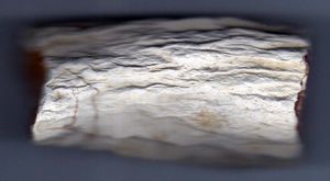 [1214] Bonjour ,je vous poste cet objet et j'aimerais que vous me disiez se que vous en dite ,SVP.Il mesure 6cm et 80 g ,il est coupé nette a une estrémitée et l'extrémitée est toute brune.On dirais un bois de cerf fossilisé.Merçi pour vos idées.