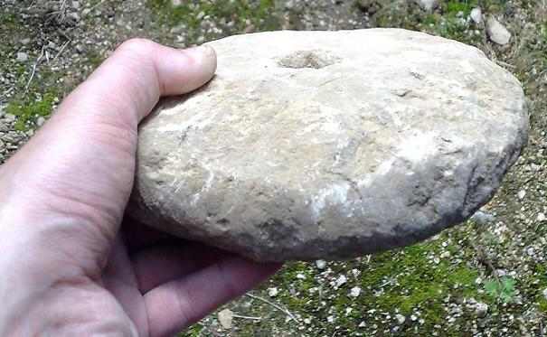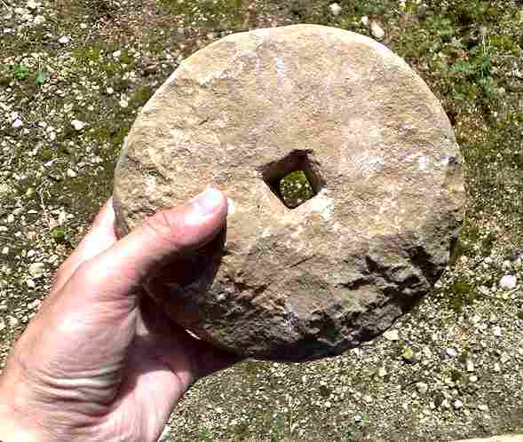 Elle me rappelle les meules de paysans montées sur un châssis et qu'on tournait avec une manivelle (le trou carré au centre de cette pierre) pour aiguiser les outils de la ferme.